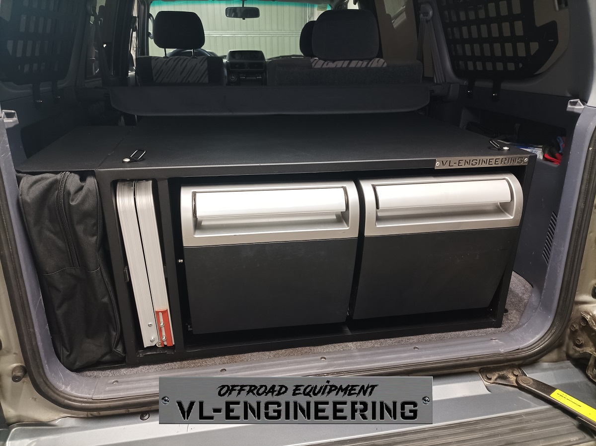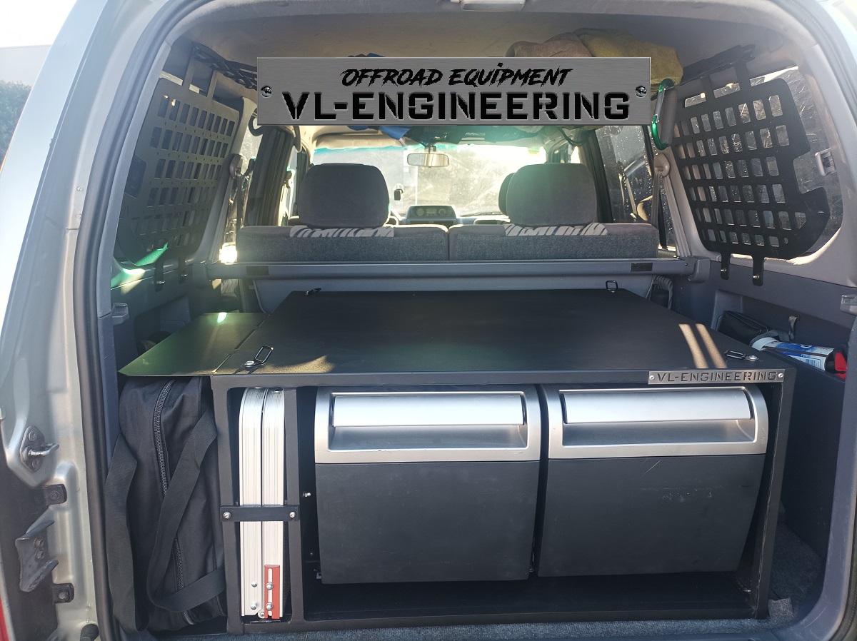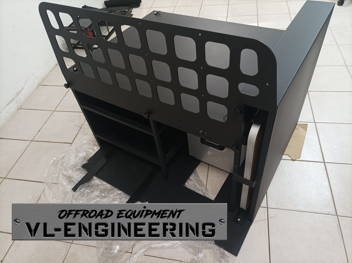 Sistema de arrumação por medida, executados em estrutura tubular de alumínio, soldada, e revestidos a chapa de alumínio, acabamento lacado preto texturado.