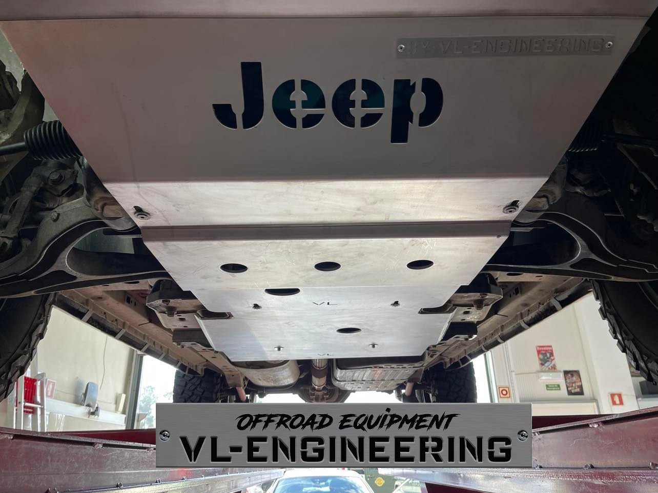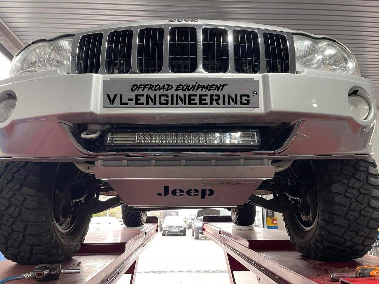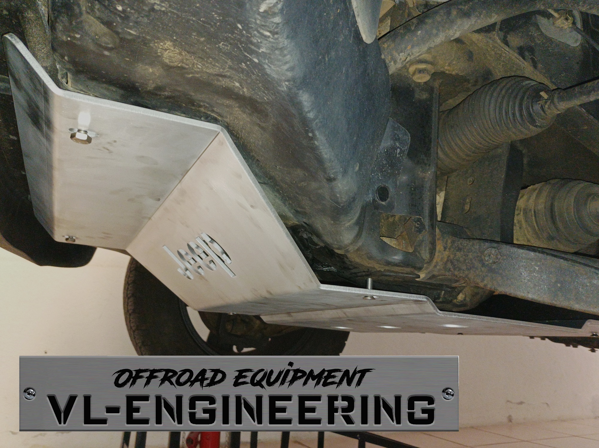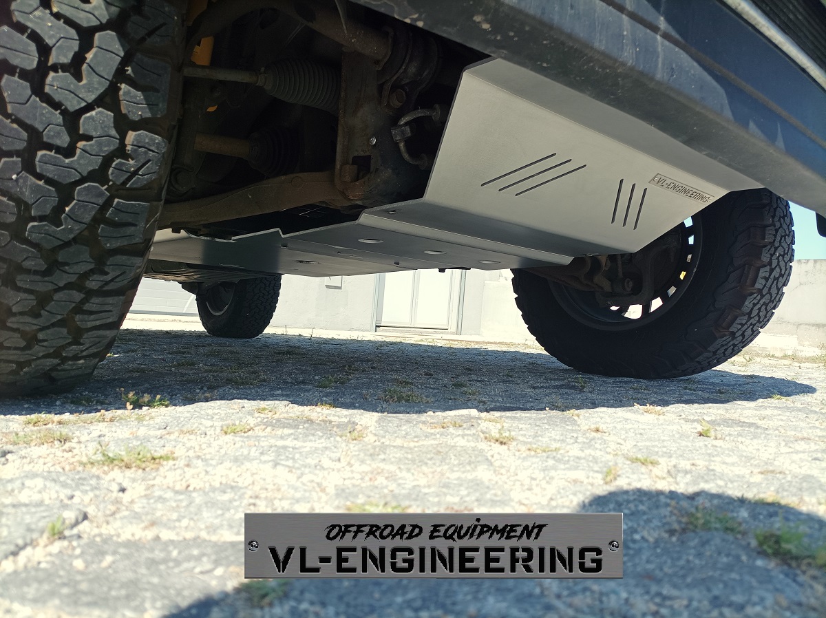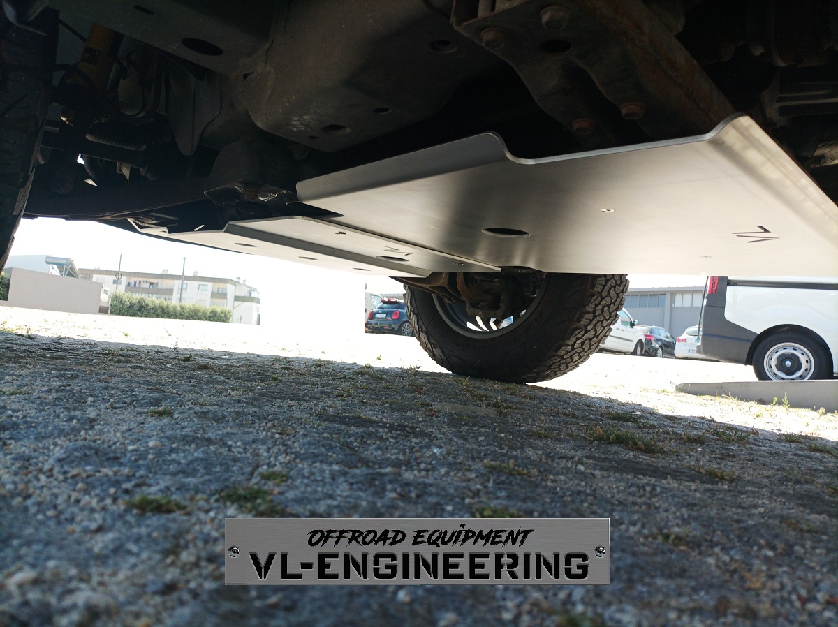 Kit de proteções composto por duas peças em alumínio marítimo com acabamento escovado que protegem radiador, motor, caixa de velocidades e caixa de transferências, incluindo suportes e todos os acessórios de montagem em aço inox;
