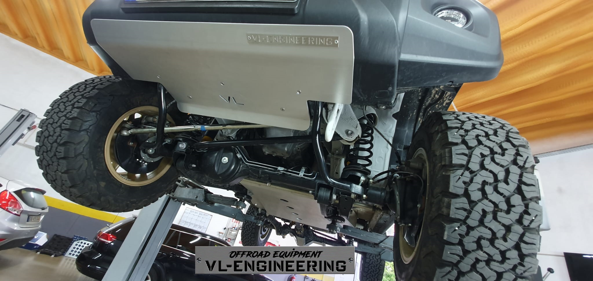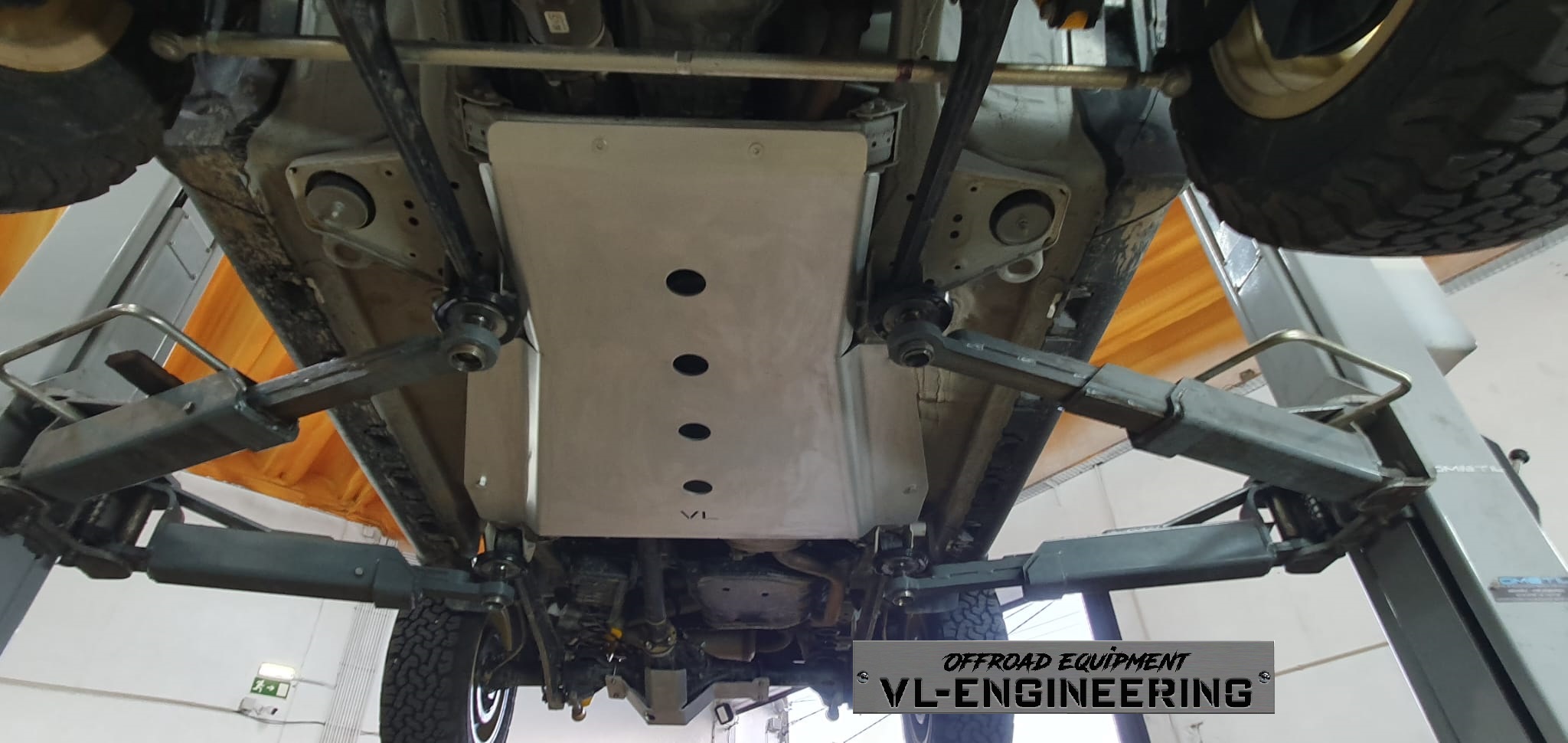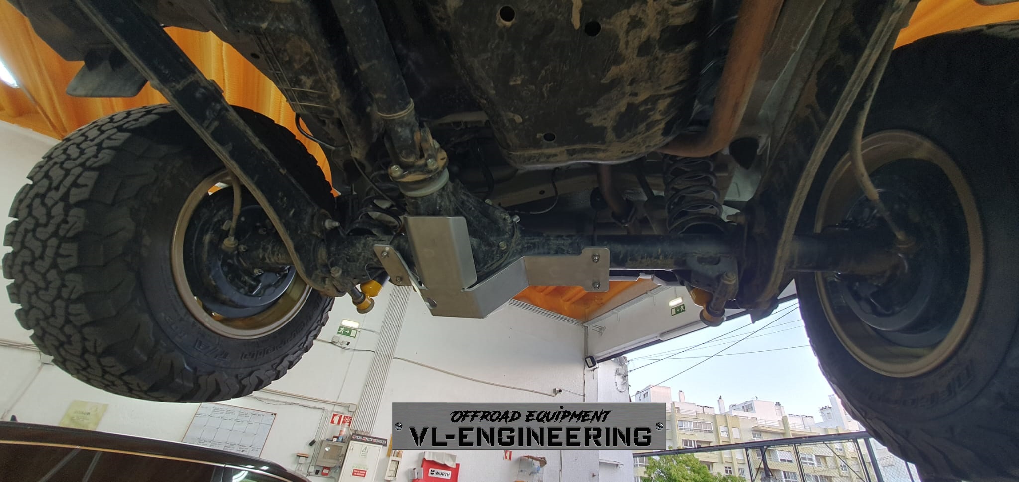 Kit de proteções composto por três peças em alumínio marítimo de 6mm com acabamento escovado, compostas por peça frontal em 6mm que protege pára-choques, radiador e motor, peças intermédia em 6mm que protege a caixa de velocidades e a caixa de transferências, e proteção do diferencial traseiro em 6mm também, incluindo suportes e todos os acessórios de montagem em aço inox;