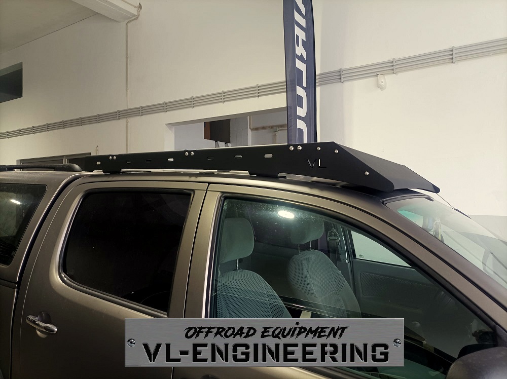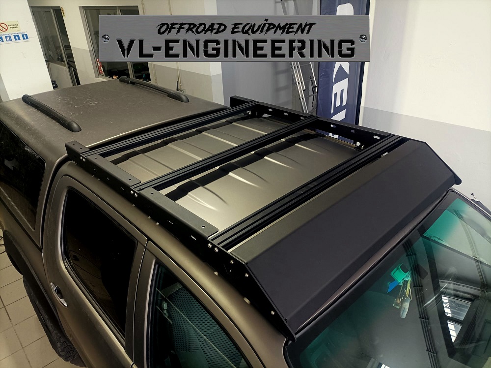 Grade de tejadilho em alumínio marítimo de 5mm, composto por duas laterais, deflector frontal e três travessas intermédias em perfil técnico, acabamento lacado a preto texturado (excepto os perfis que são acetinados preto). Incluí todos os acessórios de montagem em aço inox.