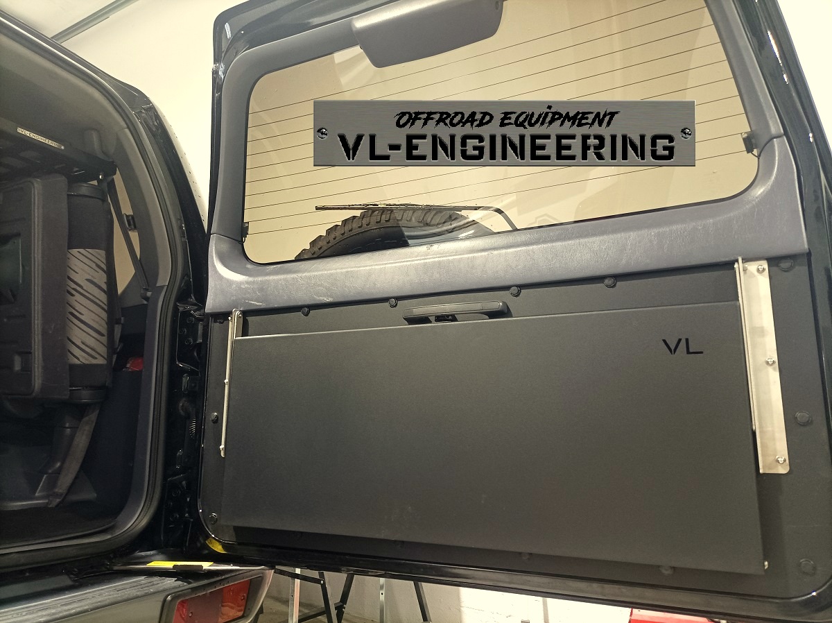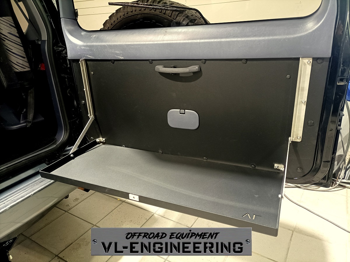 Mesa traseira composta por quartela e tabuleiro liso em alumínio marítimo de 3mm com acabamento lacado preto texturado. Inclui todos os acessórios de montagem.