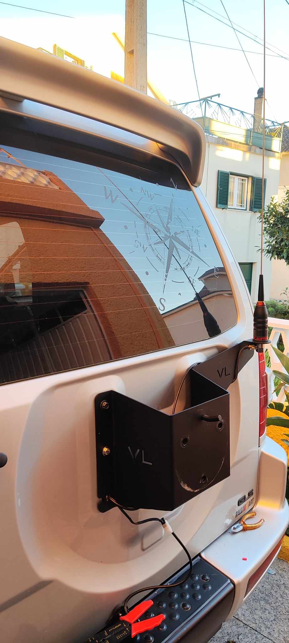 Suporte em inox de 3mm com acabamento lacado a preto texturado, desenvolvido para suporte de roda suplente de tamanho maior que a original. (Não incluí o suporte de antena, o mesmo é vendido à parte).